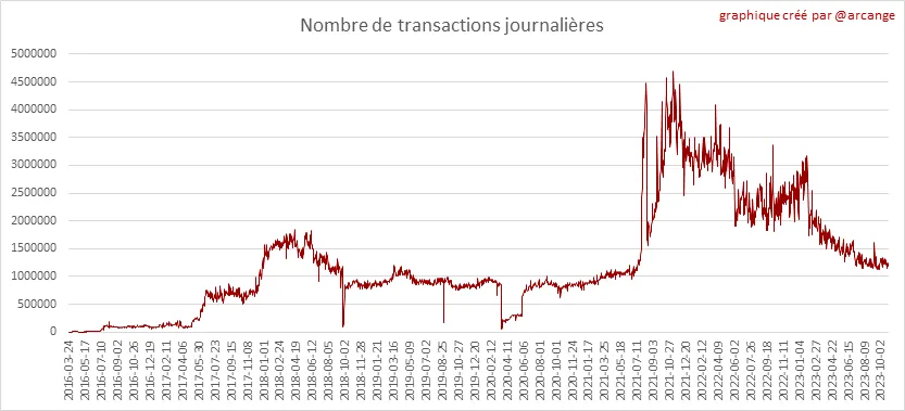 Ce graphique montre le nombre d'utilisateurs nouvellement inscrits sur la blockchain et combien d'entre eux sont devenus actifs. Nous voyons que beaucoup de comptes sont enregistrés, mais jamais utilisés. Ce graphique est un peu dynamique! Un utilisateur peut s'inscrire un jour et ne devenir actif que quelques jours plus tard. Par conséquent, le nombre d'utilisateurs actifs à une date donnée peut varier d'un jour à l'autre.