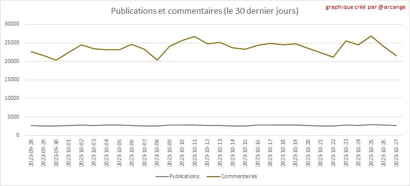 Ces graphiques montrent l'évolution des publications et des commentaires pour toute la durée de vie de la blockchain et pour les 30 derniers jours.