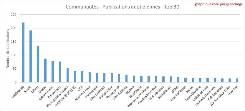 Ces graphiques montrent les communautés les plus actives en termes de publications depuis la leur création et pour le jour passé.
