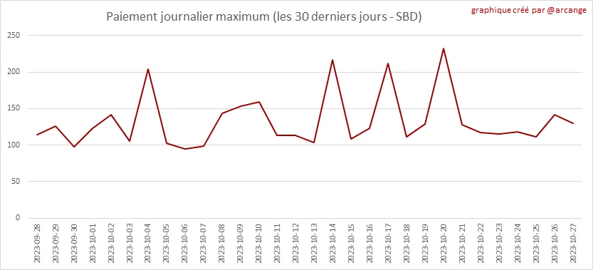 Ce graphique montrent la récompense maximale payée sur un message (ou un commentaire) au cours des 30 derniers jours.