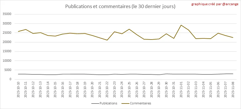 Ces graphiques montrent l'évolution des publications et des commentaires pour toute la durée de vie de la blockchain et pour les 30 derniers jours.