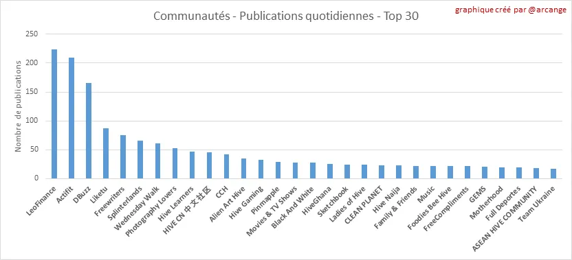 Ces graphiques montrent les communautés les plus actives en termes de publications depuis la leur création et pour le jour passé.