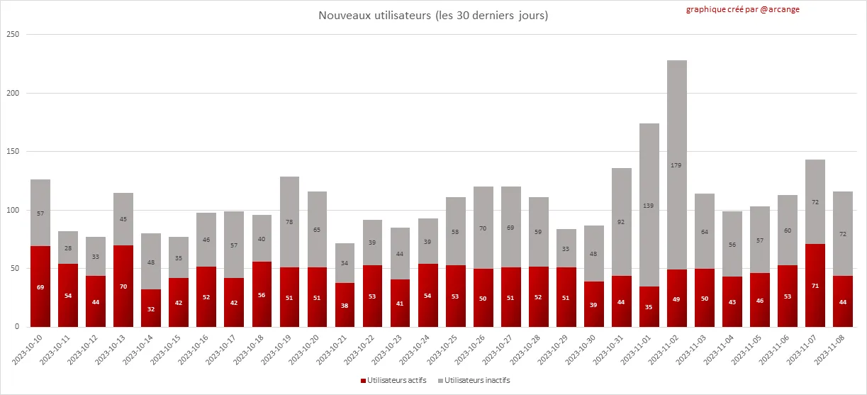 La partie grise de chaque colonne indique le nombre de comptes inactifs (ceux qui n'ont plus publié, commenté ou voté depuis 30 jours).