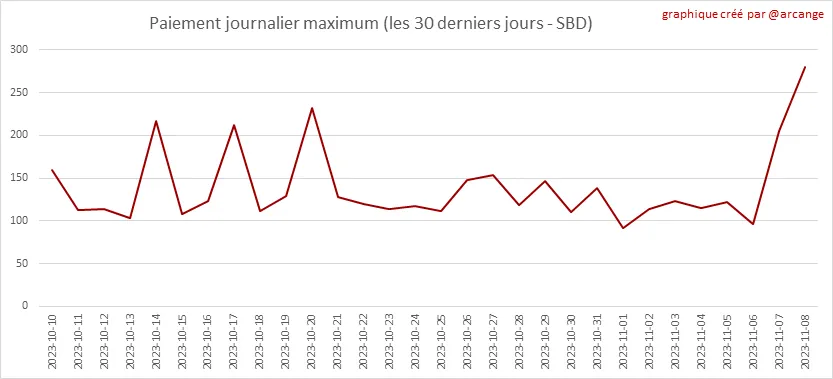 Ce graphique montrent la récompense maximale payée sur un message (ou un commentaire) au cours des 30 derniers jours.