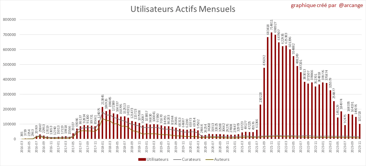 Le dernier graphique est un résumé mensuel des utilisateurs actifs. Attention en interpretant la valeur de la dernière colonne qui peut être largement inférieure si la fin du mois n'a pas encore été atteinte.
