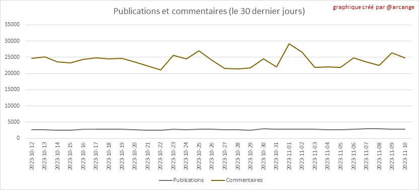 Ces graphiques montrent l'évolution des publications et des commentaires pour toute la durée de vie de la blockchain et pour les 30 derniers jours.