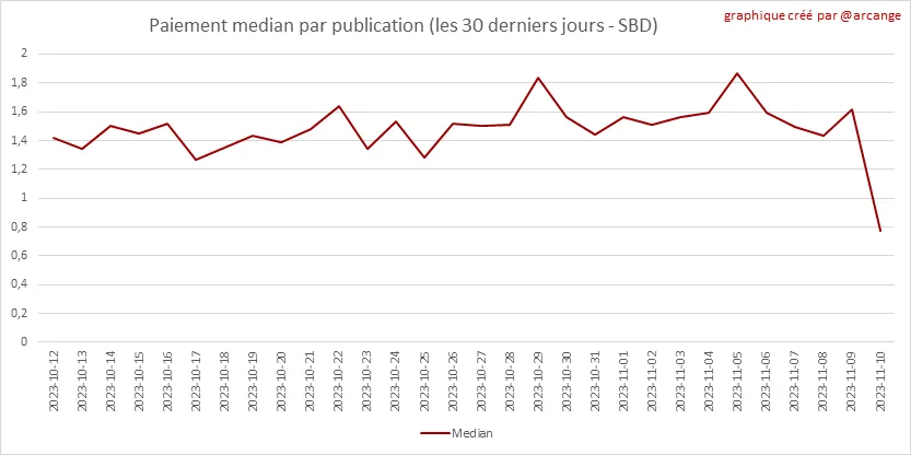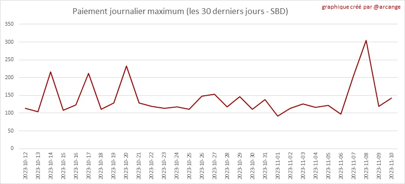 Ce graphique montrent la récompense maximale payée sur un message (ou un commentaire) au cours des 30 derniers jours.