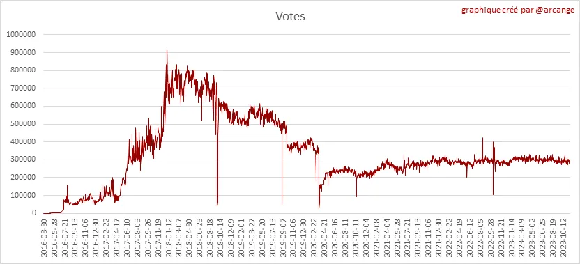Ces graphiques montrent l'évolution de la curation (votes positifs) depuis la création de la blockchain et pour les 30 derniers jours.