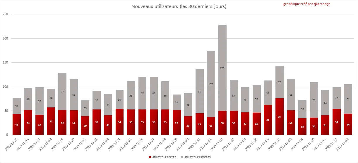 La partie grise de chaque colonne indique le nombre de comptes inactifs (ceux qui n'ont plus publié, commenté ou voté depuis 30 jours).