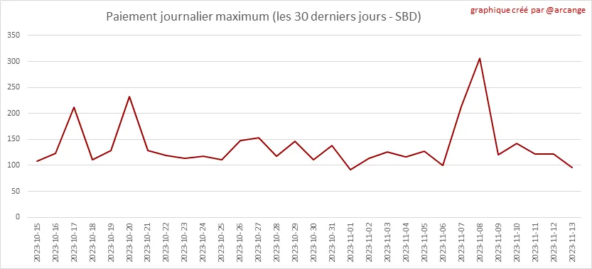 Ce graphique montrent la récompense maximale payée sur un message (ou un commentaire) au cours des 30 derniers jours.