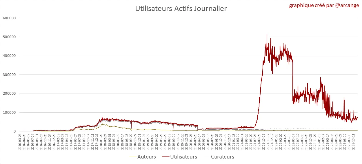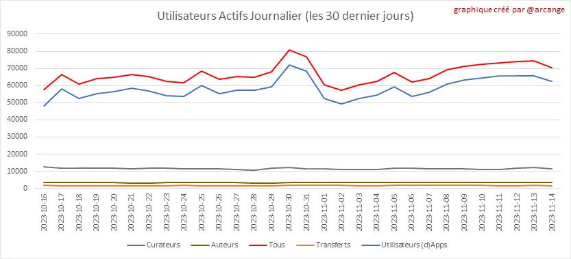Toutes les informations présentées dans ce rapport sont basées sur les données collectées dans la blockchain jusqu'au 14-11-2023 à minuit, heure UTC. L'objectif de ce rapport est de vous fournir une vision claire de ce qui se passe quotidiennement dans la blockchain Hive.