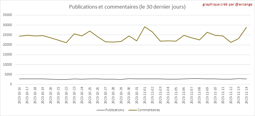 Ces graphiques montrent l'évolution des publications et des commentaires pour toute la durée de vie de la blockchain et pour les 30 derniers jours.