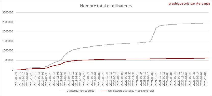 Le dernier graphique est un résumé mensuel des utilisateurs actifs. Attention en interpretant la valeur de la dernière colonne qui peut être largement inférieure si la fin du mois n'a pas encore été atteinte.