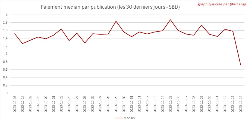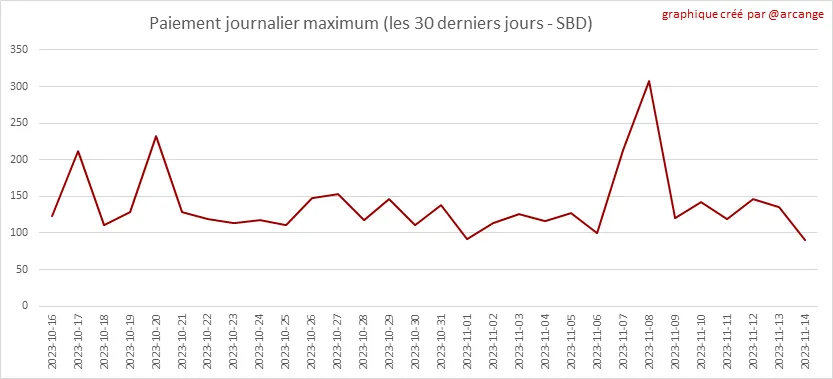 Ce graphique montrent la récompense maximale payée sur un message (ou un commentaire) au cours des 30 derniers jours.