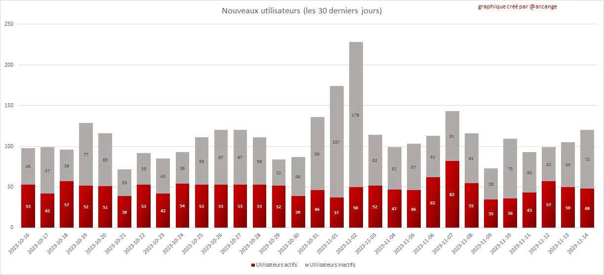 La partie grise de chaque colonne indique le nombre de comptes inactifs (ceux qui n'ont plus publié, commenté ou voté depuis 30 jours).