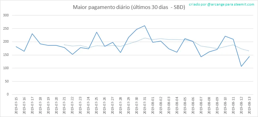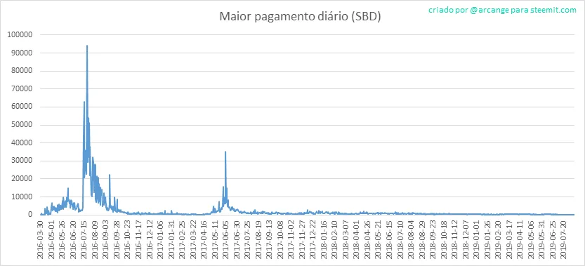 Este gráfico mostra o máximo de recompensa pago por um post (ou comentário), em cada dia (durante todo funcionamento da blockchain e os últimos 30 dias)