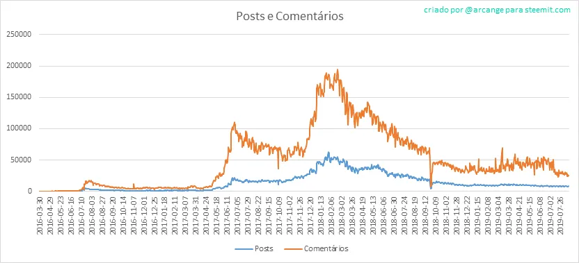 Esses gráficos mostram a evolução dos posts e comentários desde o início da blockchain e dos últimos 30 dias.