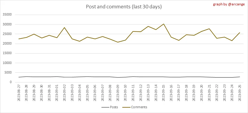 These graphs show the evolution of posts and comments for the whole blockchain lifetime and the last 30 days.