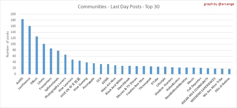 These graphs show the most active communities by number of posts (blockchain lifetime and last day).