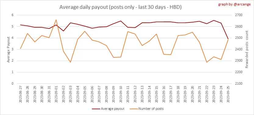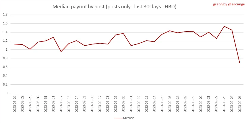 These graphs show the average and median payout per post for the last 30 days.