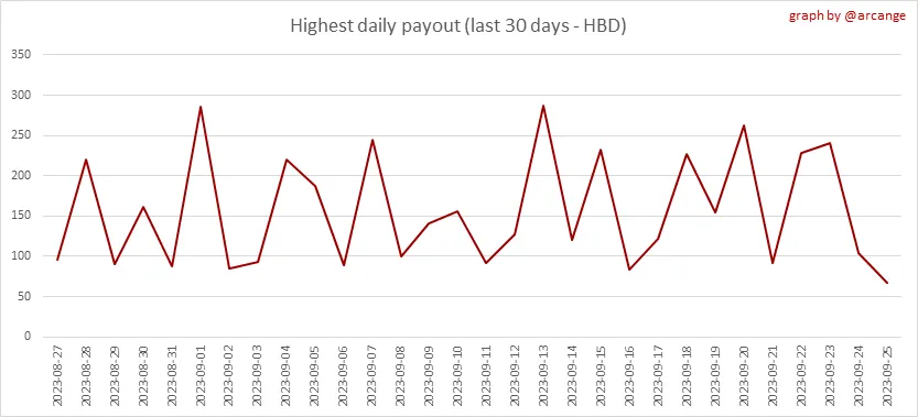 This graph shows the highest reward paid on a post (or comment) for the last 30 days.