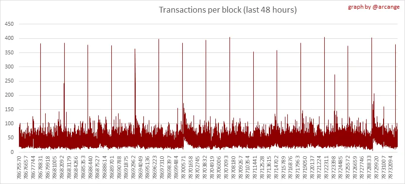 These graphs show the number of transactions per day, and the highest number of transactions per block, the average number of transactions per block, and the number of transactions per block for the last 48 hours. This gives you an idea of the whole activity on the blockchain.