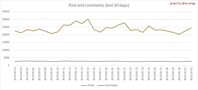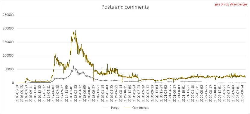 These graphs show the evolution of posts and comments for the whole blockchain lifetime and the last 30 days.