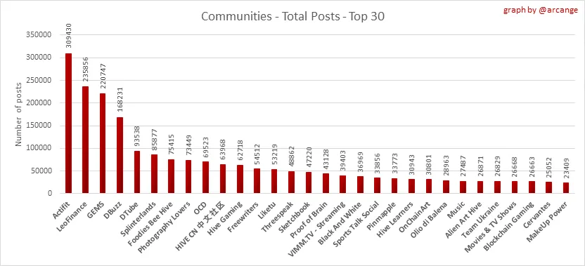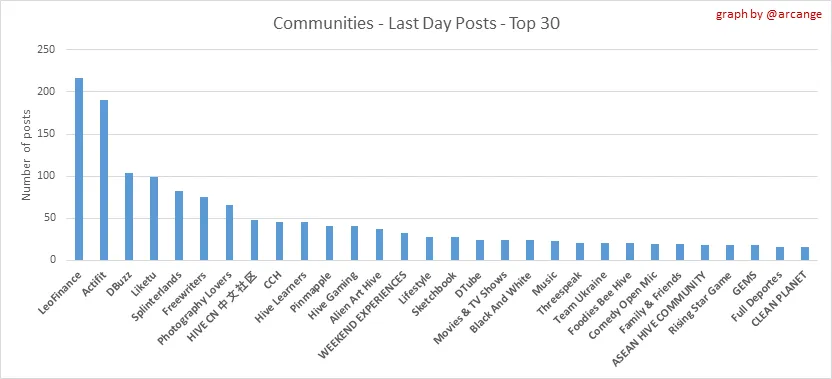 These graphs show the most active communities by number of posts (blockchain lifetime and last day).