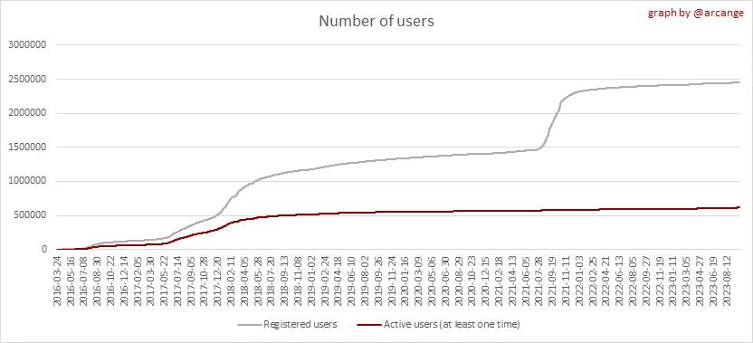 This chart shows the number of newly registered users on the blockchain and how many of them became active. The chart is kind of dynamic! A user can register one day and become active a few days later. Therefore, the number of active users on a specific date may change from day to day.