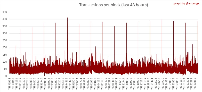 These graphs show the number of transactions per day, and the highest number of transactions per block, the average number of transactions per block, and the number of transactions per block for the last 48 hours. This gives you an idea of the whole activity on the blockchain.