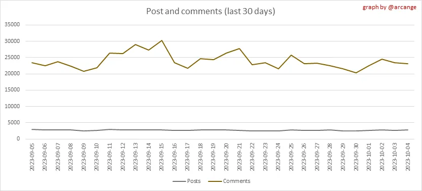 These graphs show the evolution of posts and comments for the whole blockchain lifetime and the last 30 days.