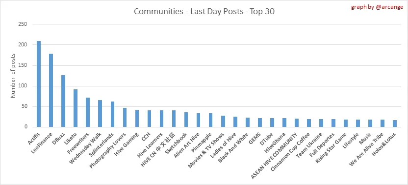 These graphs show the most active communities by number of posts (blockchain lifetime and last day).
