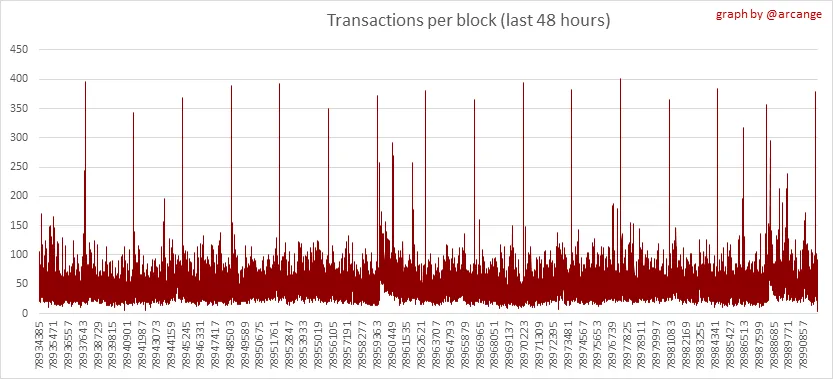 These graphs show the number of transactions per day, and the highest number of transactions per block, the average number of transactions per block, and the number of transactions per block for the last 48 hours. This gives you an idea of the whole activity on the blockchain.
