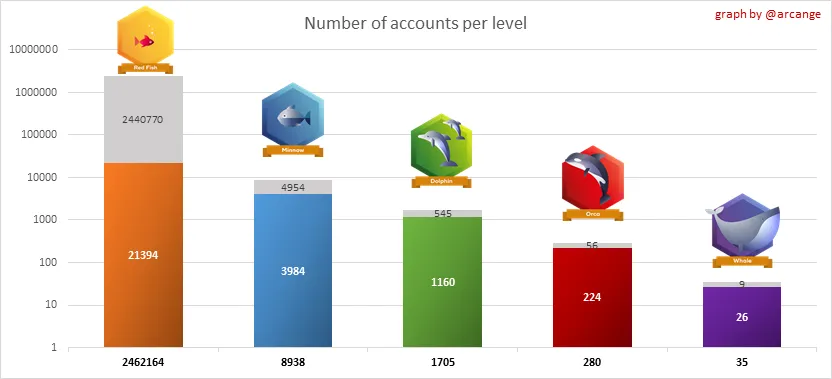 This graph shows the distribution of Hive Power cumulated per account level. The left graph shows the distribution without taking into account any delegation made or received by the accounts. The right graphs take into account delegation, adds received HP delegation and subtracts given HP delegation.
