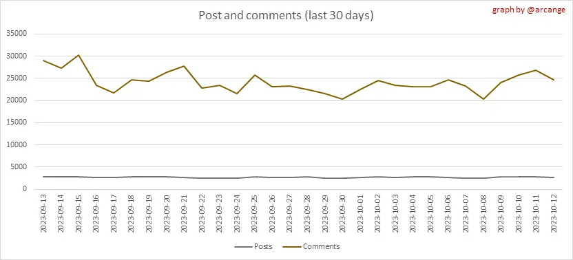 These graphs show the evolution of posts and comments for the whole blockchain lifetime and the last 30 days.