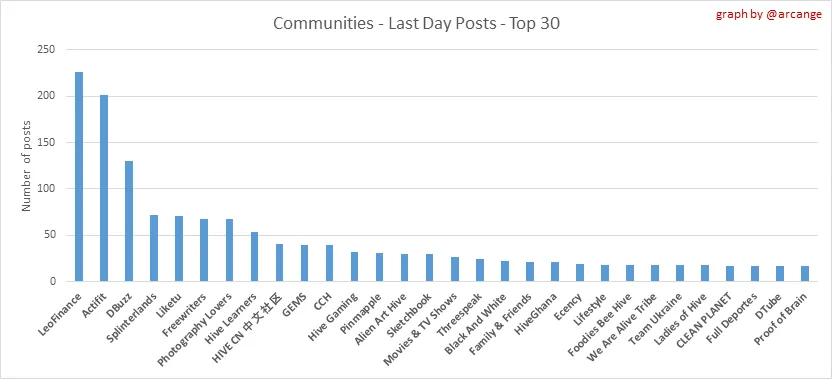 These graphs show the most active communities by number of posts (blockchain lifetime and last day).