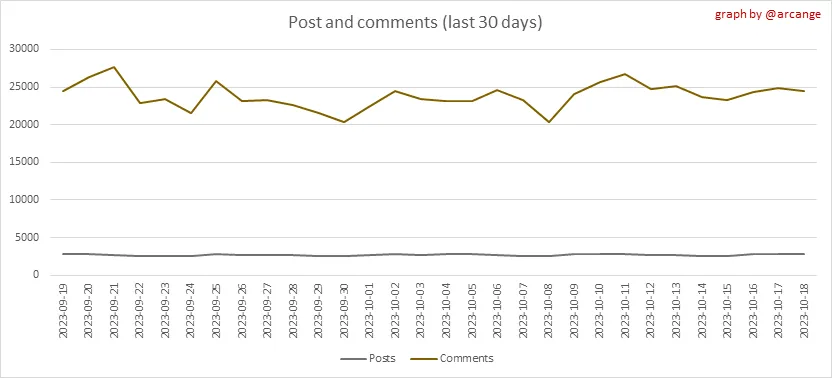These graphs show the evolution of posts and comments for the whole blockchain lifetime and the last 30 days.
