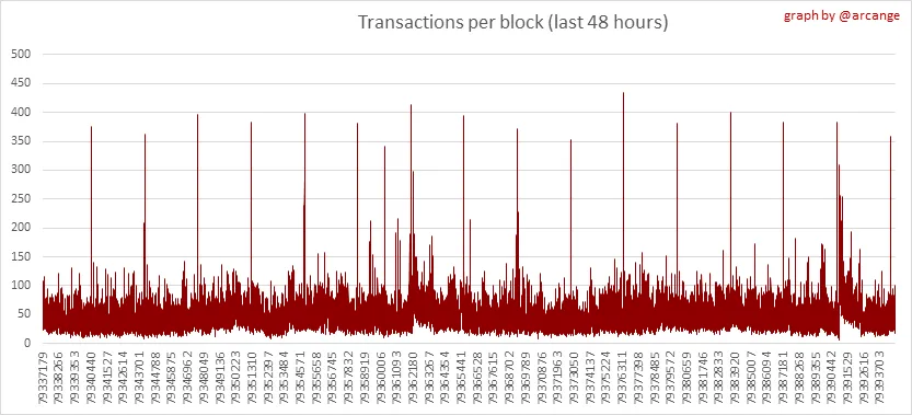 These graphs show the number of transactions per day, and the highest number of transactions per block, the average number of transactions per block, and the number of transactions per block for the last 48 hours. This gives you an idea of the whole activity on the blockchain.