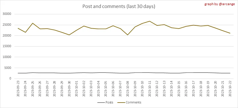 These graphs show the evolution of posts and comments for the whole blockchain lifetime and the last 30 days.