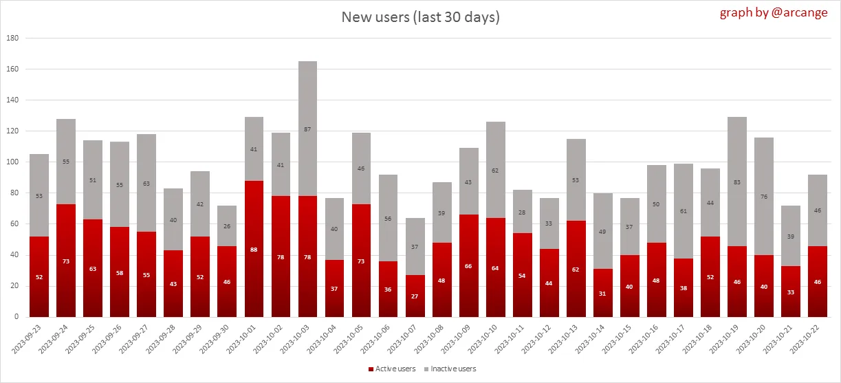 These two graphs show who created new accounts during the last day and the total number of registered accounts. The red line shows how many of them have been active at least once (active meaning publishing a post, commenting or voting). They are included even if they become inactive later.