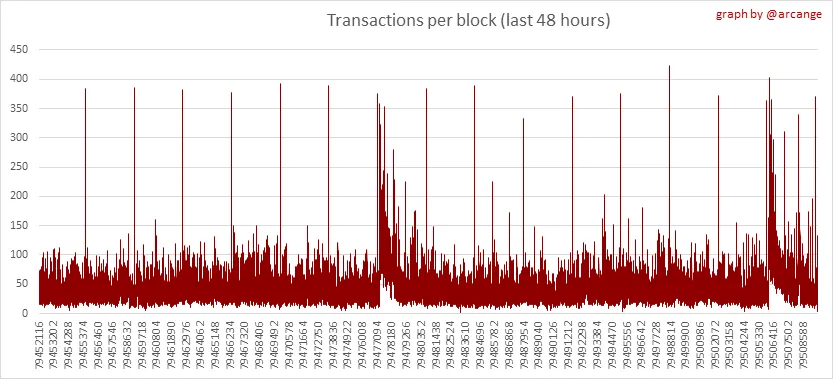 These graphs show the number of transactions per day, and the highest number of transactions per block, the average number of transactions per block, and the number of transactions per block for the last 48 hours. This gives you an idea of the whole activity on the blockchain.