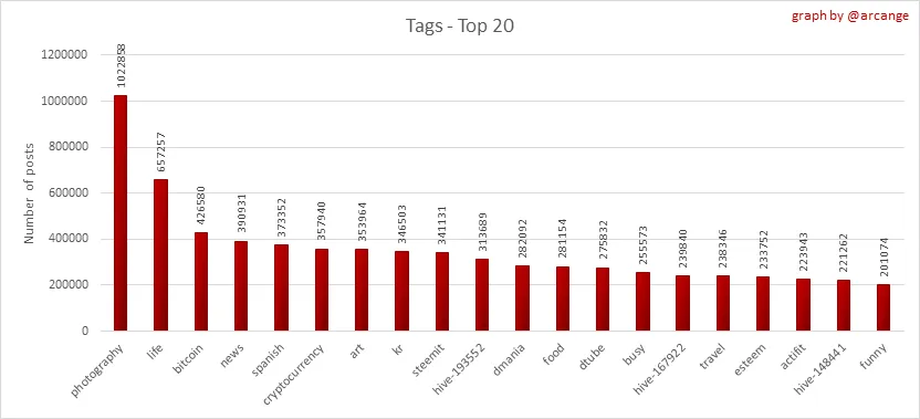 These graphs show which main tags have been the most used for publishing posts for the whole blockchain lifetime and the last day.