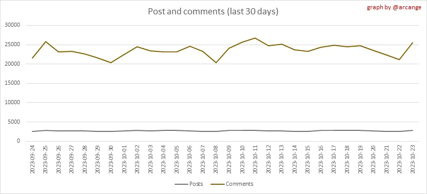 These graphs show the evolution of posts and comments for the whole blockchain lifetime and the last 30 days.