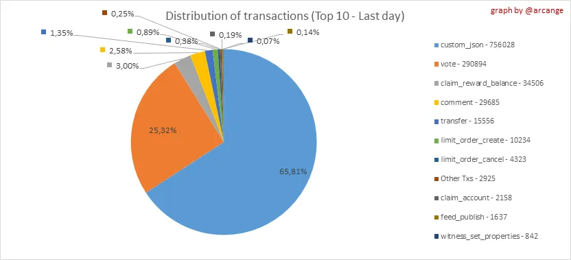 This graph shows the distribution of the top 10 types of transactions by number of operations performed on the blockchain.