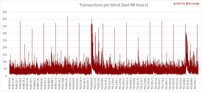 These graphs show the number of transactions per day, and the highest number of transactions per block, the average number of transactions per block, and the number of transactions per block for the last 48 hours. This gives you an idea of the whole activity on the blockchain.