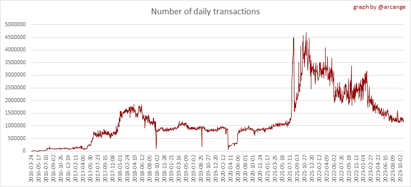 These graphs show the number of transactions per day, and the highest number of transactions per block, the average number of transactions per block, and the number of transactions per block for the last 48 hours. This gives you an idea of the whole activity on the blockchain.