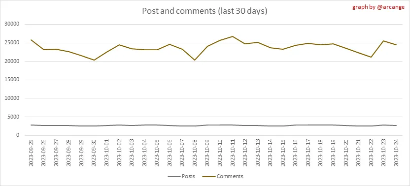 These graphs show the evolution of posts and comments for the whole blockchain lifetime and the last 30 days.
