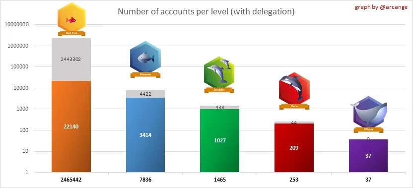 This graph shows the distribution of Hive Power cumulated per account level. The left graph shows the distribution without taking into account any delegation made or received by the accounts. The right graphs take into account delegation, adds received HP delegation and subtracts given HP delegation.
