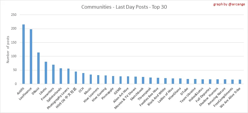 These graphs show the most active communities by number of posts (blockchain lifetime and last day).