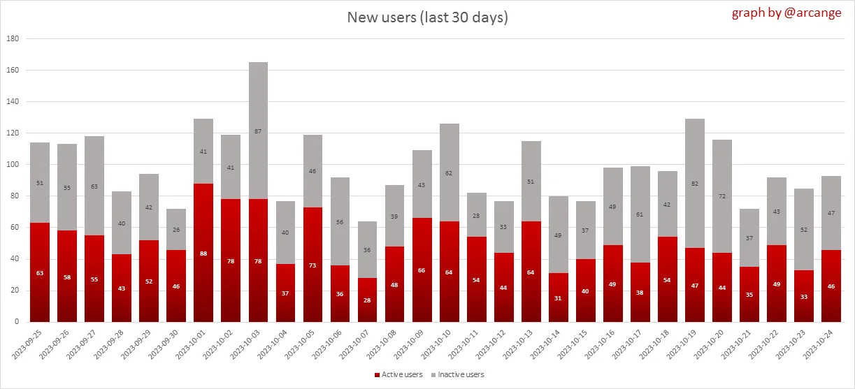 These two graphs show who created new accounts during the last day and the total number of registered accounts. The red line shows how many of them have been active at least once (active meaning publishing a post, commenting or voting). They are included even if they become inactive later.